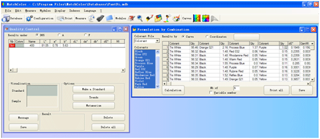 4 - Formulacja przez połączenie: Ten moduł formulacji łączy wszystkie barwniki z pliku barwników, aby obliczyć tysiące formuł i wyświetlić najlepsze pod względem DE, ceny lub metameryzmu.